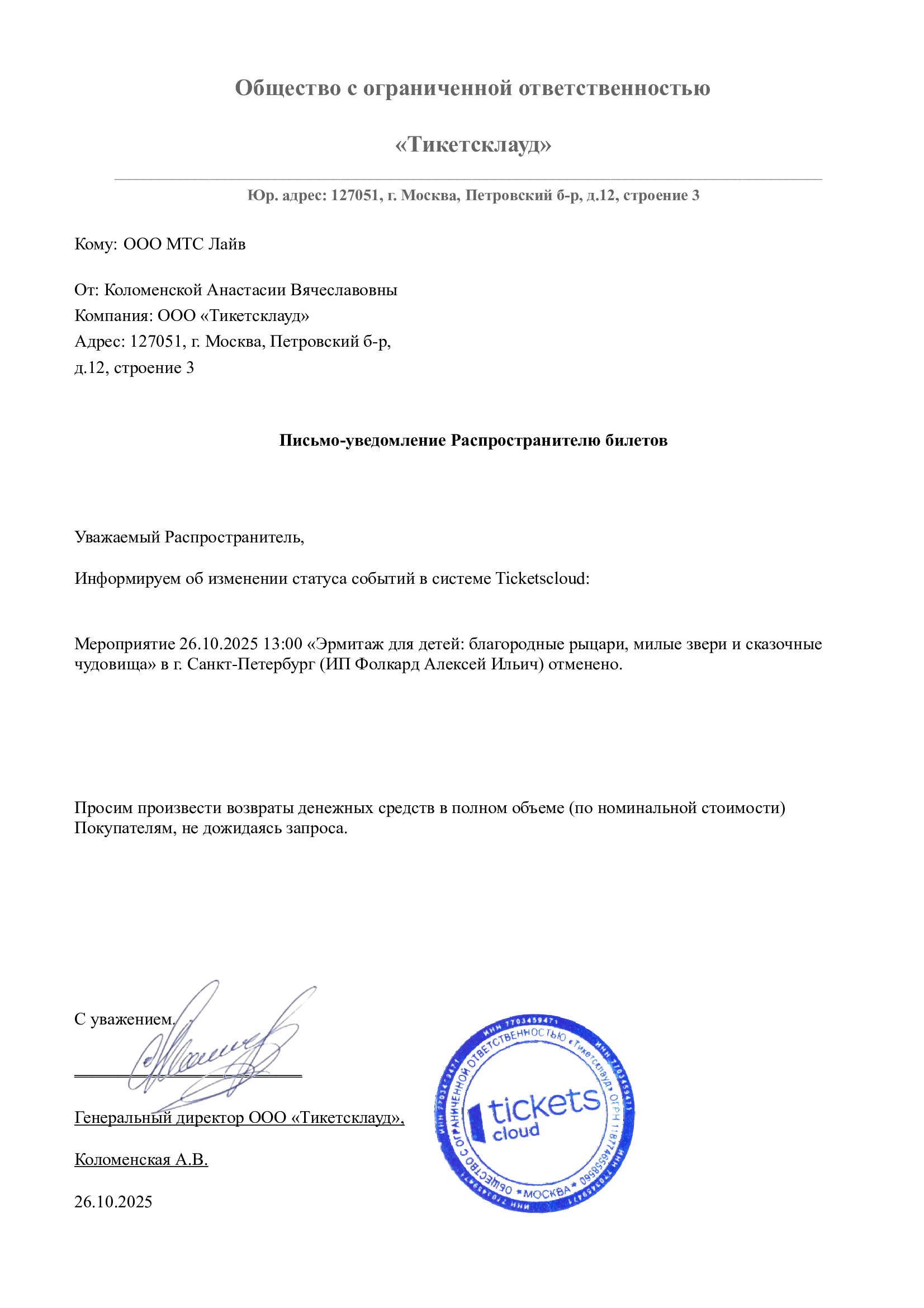Уважаемый клиент! Спешим сообщить, что по информации, полученной от организатора, экскурсия «Эрмитаж для детей: благородные рыцари, милые звери и сказочные чудовища», запланированная на 26 октября 2025 года в 13:00 в Государственном Эрмитаже, отменена. Деньги за электронные билеты вернутся автоматически в полном объёме на карту, с которой была произведена оплата. Если вы купили билет в кассе Ticketland.ru за наличный расчет, то обратитесь, пожалуйста, на почту: vozvrat@ticketland.ru. С уважением, команда поддержки Ticketland.