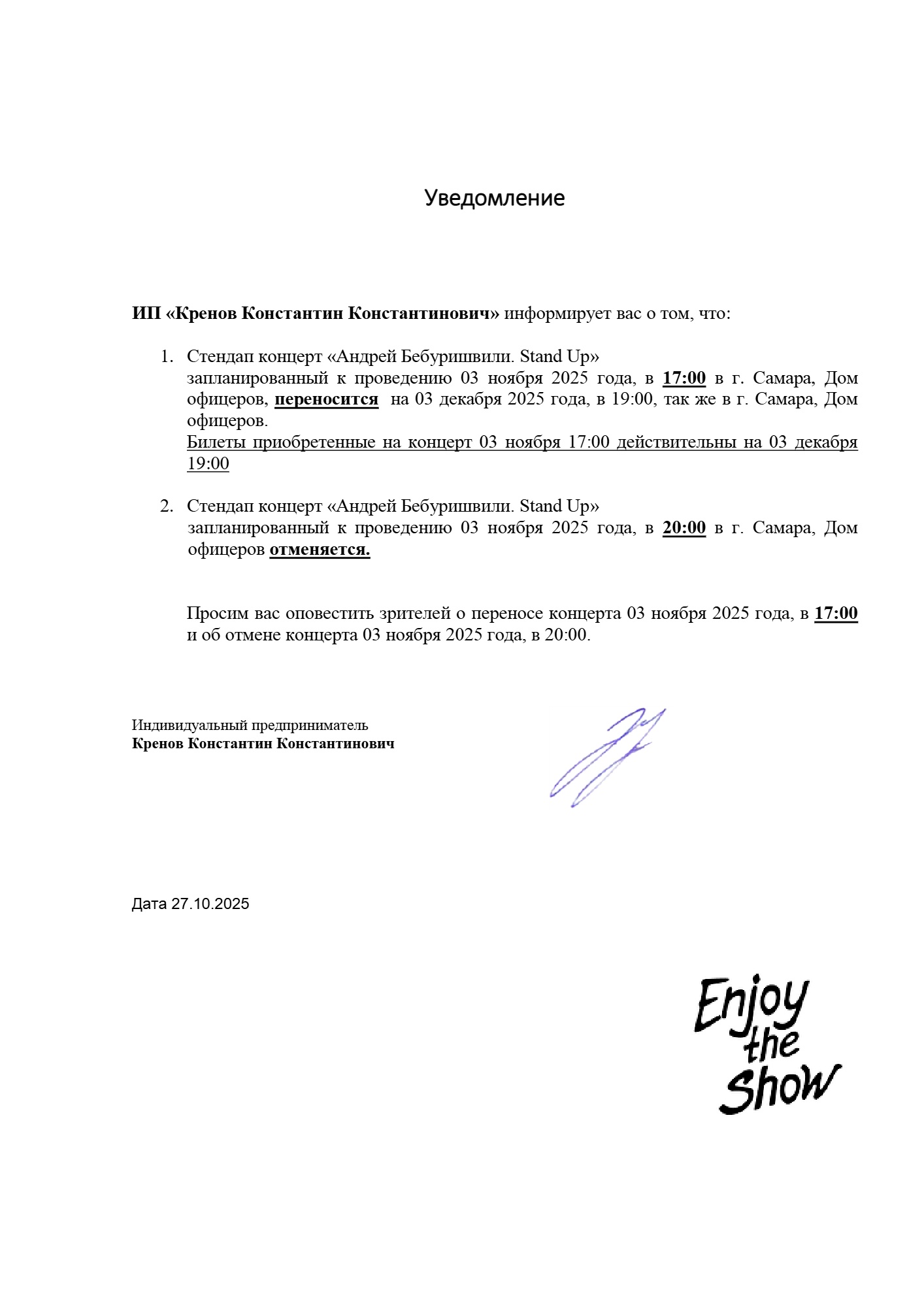 Уважаемый клиент! Спешим сообщить, что по информации, полученной от организатора, Stand Up концерт Андрея Бебуришвили, запланированный на 3 ноября 2025 года в 17:00 в Окружном Доме Офицеров (Самара), перенесён на 3 декабря 2025 года, начало в 19:00. Ранее приобретенные билеты действительны на новую дату, обменивать их не нужно. Если вам не удобно посетить мероприятие в новую дату, вы можете вернуть билет по кнопке в личном кабинете во вкладке «Заказы» (до 03.12.25 19:00). Деньги за электронные билеты вернутся автоматически в полном объёме на карту, с которой была произведена оплата. Если вы купили билет в кассе Ticketland.ru за наличный расчет, то обратитесь, пожалуйста, на почту: vozvrat@ticketland.ru. С уважением, команда поддержки Ticketland.