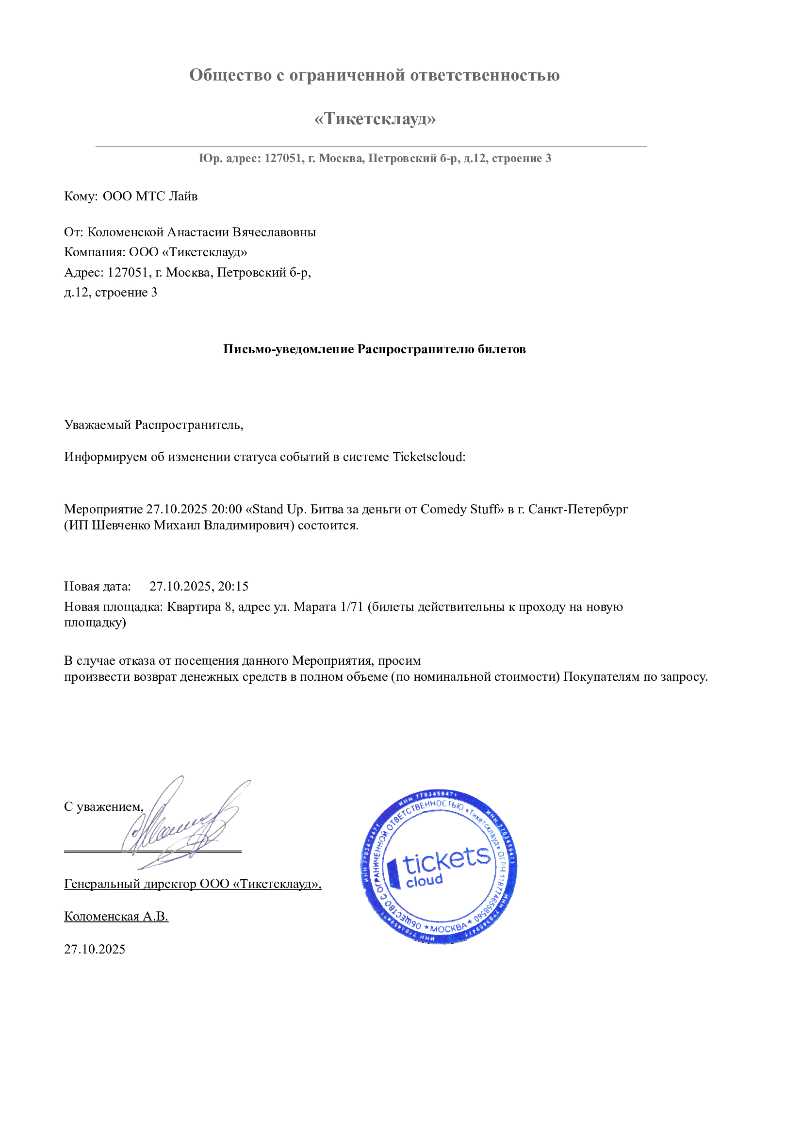 Уважаемый клиент! Спешим сообщить, что по информации, полученной от организатора, концерт «Stand Up. Битва за деньги от Comedy Stuff», запланированный на 27 октября 2025 года в 20:00 Ресторане Commode, перенесён на 27 октября 2025 года, начало в 20:15. Также у концерта меняется площадка. Новое место проведения концерта: «Квартира 8» (г. Санкт-Петербург, ул. Марата, 1/71). Ранее приобретенные билеты действительны на новую площадку, обменивать их не нужно. Если вам не удобно посетить концерт на новой площадке, вы можете вернуть билет по кнопке в личном кабинете во вкладке «Заказы». Деньги за электронные билеты вернутся автоматически в полном объёме на карту, с которой была произведена оплата. Если вы купили билет в кассе Ticketland.ru за наличный расчет, то обратитесь, пожалуйста, на почту: vozvrat@ticketland.ru. С уважением, команда поддержки Ticketland.