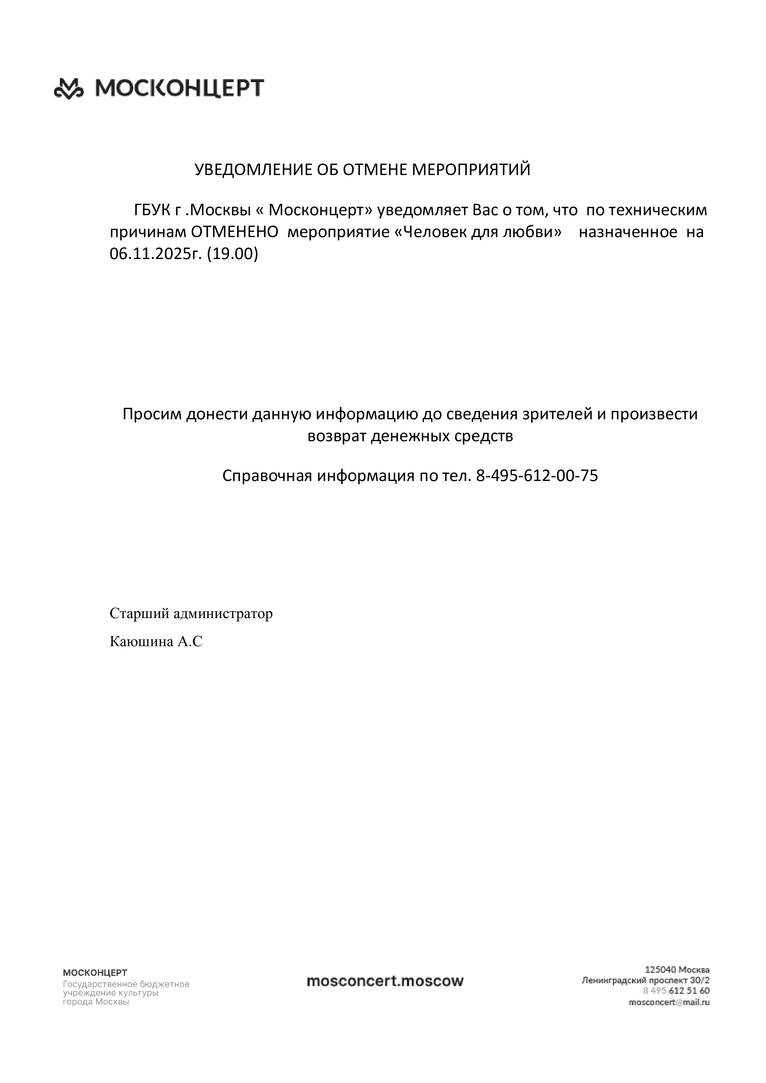 Уважаемый клиент! Спешим сообщить, что по информации, полученной от организатора, мероприятие «Человек для любви», запланированное на 6 ноября 2025 года в 19:00 в Киноконцертном зале «Эльдар», отменено. Деньги за электронные билеты вернутся автоматически в полном объёме на карту, с которой была произведена оплата. Если вы купили билет в кассе Ticketland.ru за наличный расчет, то обратитесь, пожалуйста, на почту: vozvrat@ticketland.ru. С уважением, команда поддержки Ticketland.