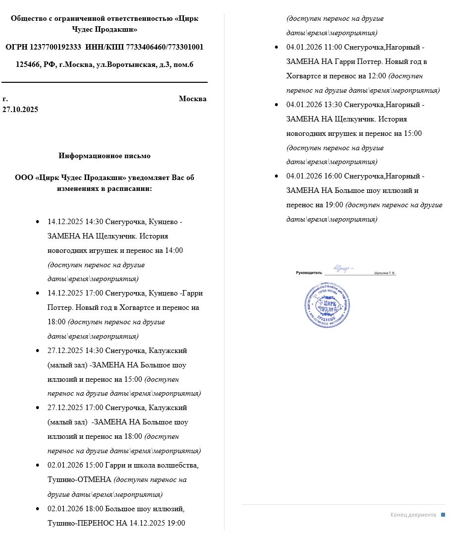 Уважаемый клиент! Спешим сообщить, что по информации, полученной от организатора, спектакль «Снегурочка», запланированный на 14 декабря 2025 года в 14:30 в Цирке Чудес в Кунцево, заменен на спектакль «Щелкунчик» и перенесен на 14:00. Ранее приобретенные билеты действительны. По вопросам возвратов и обменов билетов обращайтесь, пожалуйста, к организатору по следующим контактным данным: +7 (495) 445-49-45 и office@aivengo-t.ru. С уважением, команда поддержки Ticketland